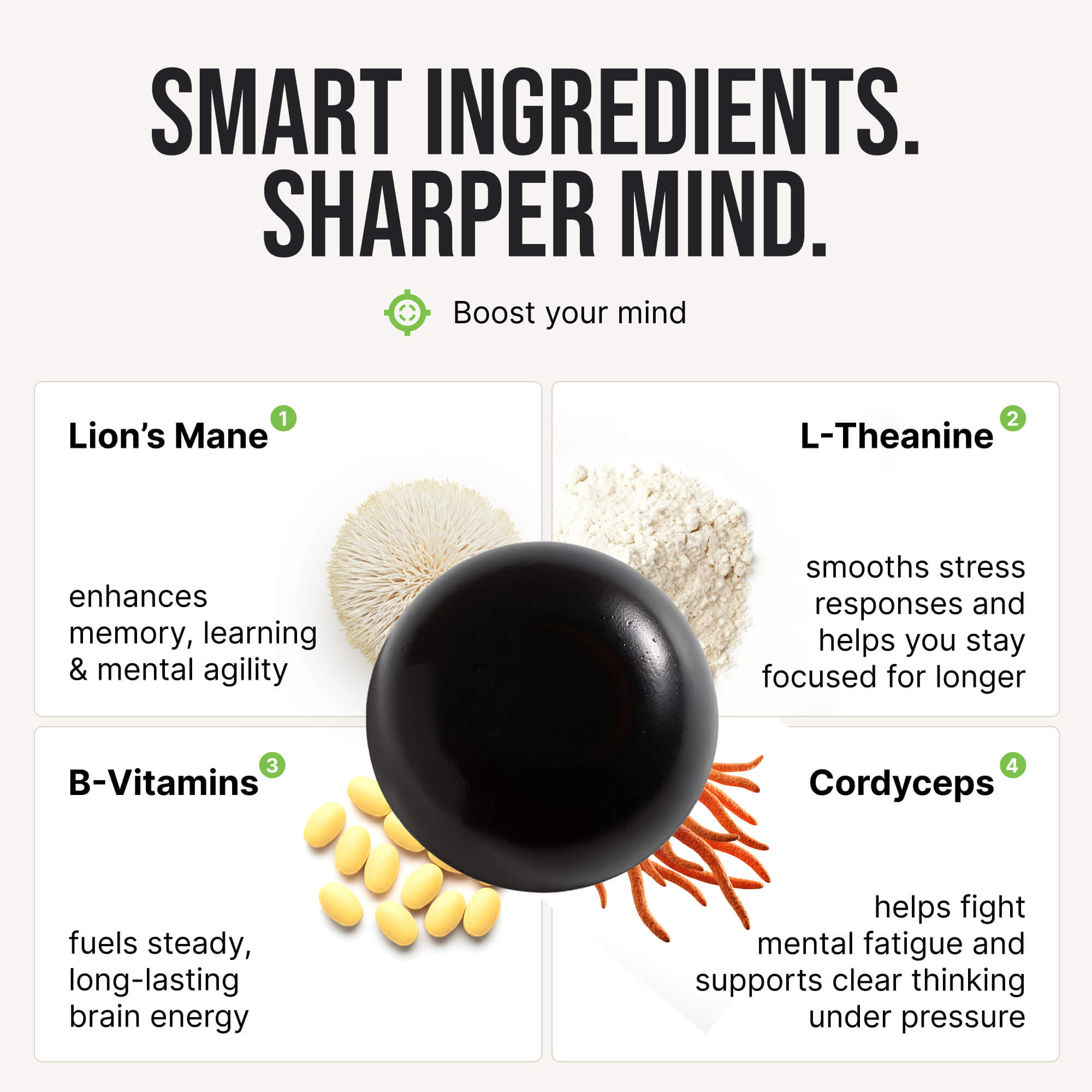 Lion’s Mane, Cordyceps, Taurine, Green Tea Extract, and B vitamins, all backed by research for brain function.