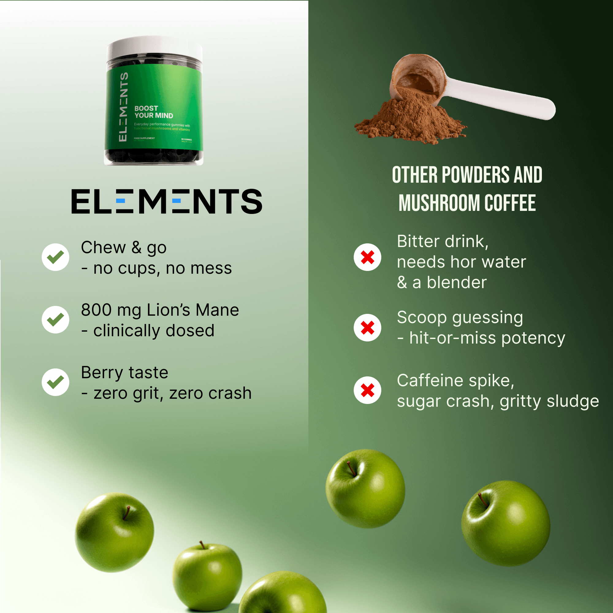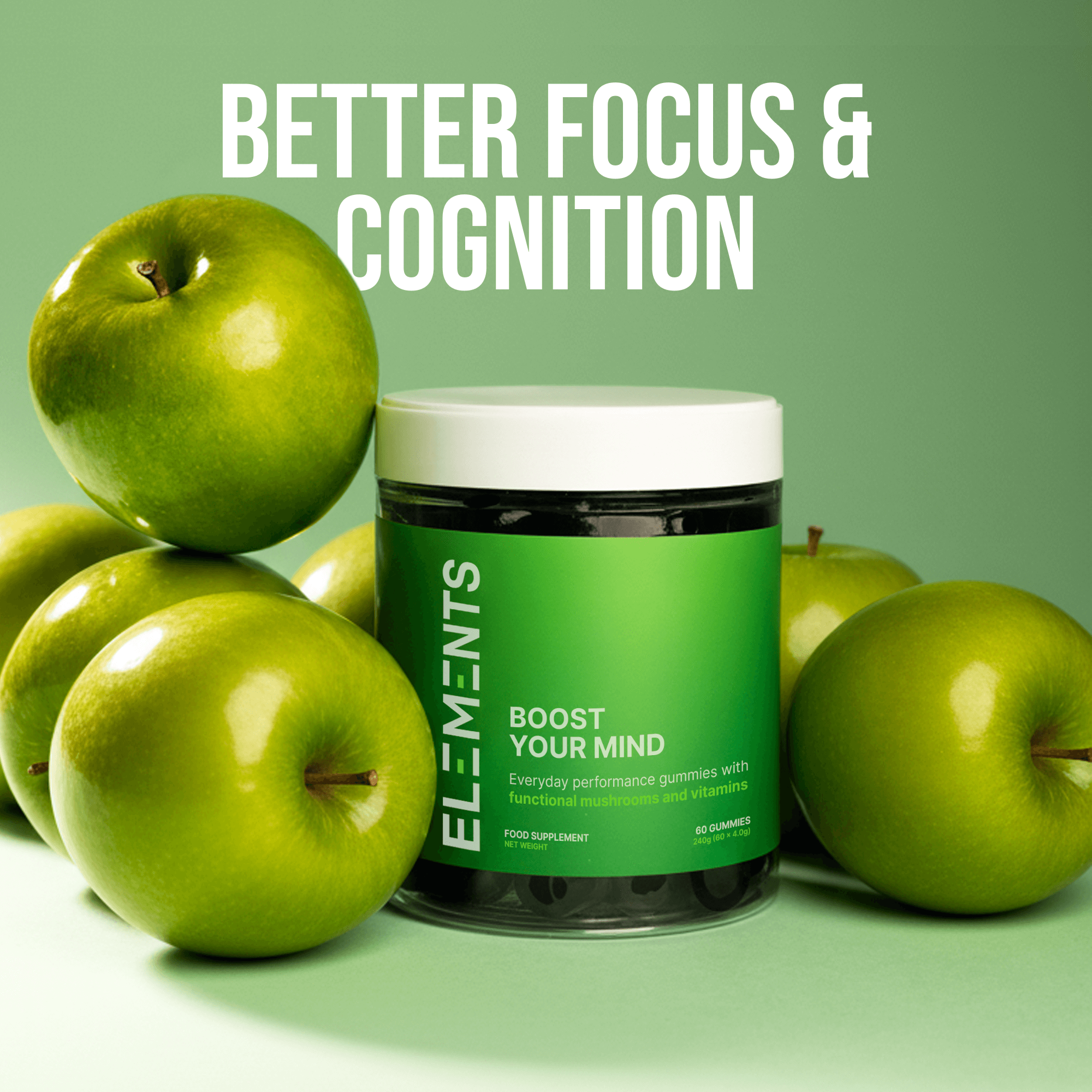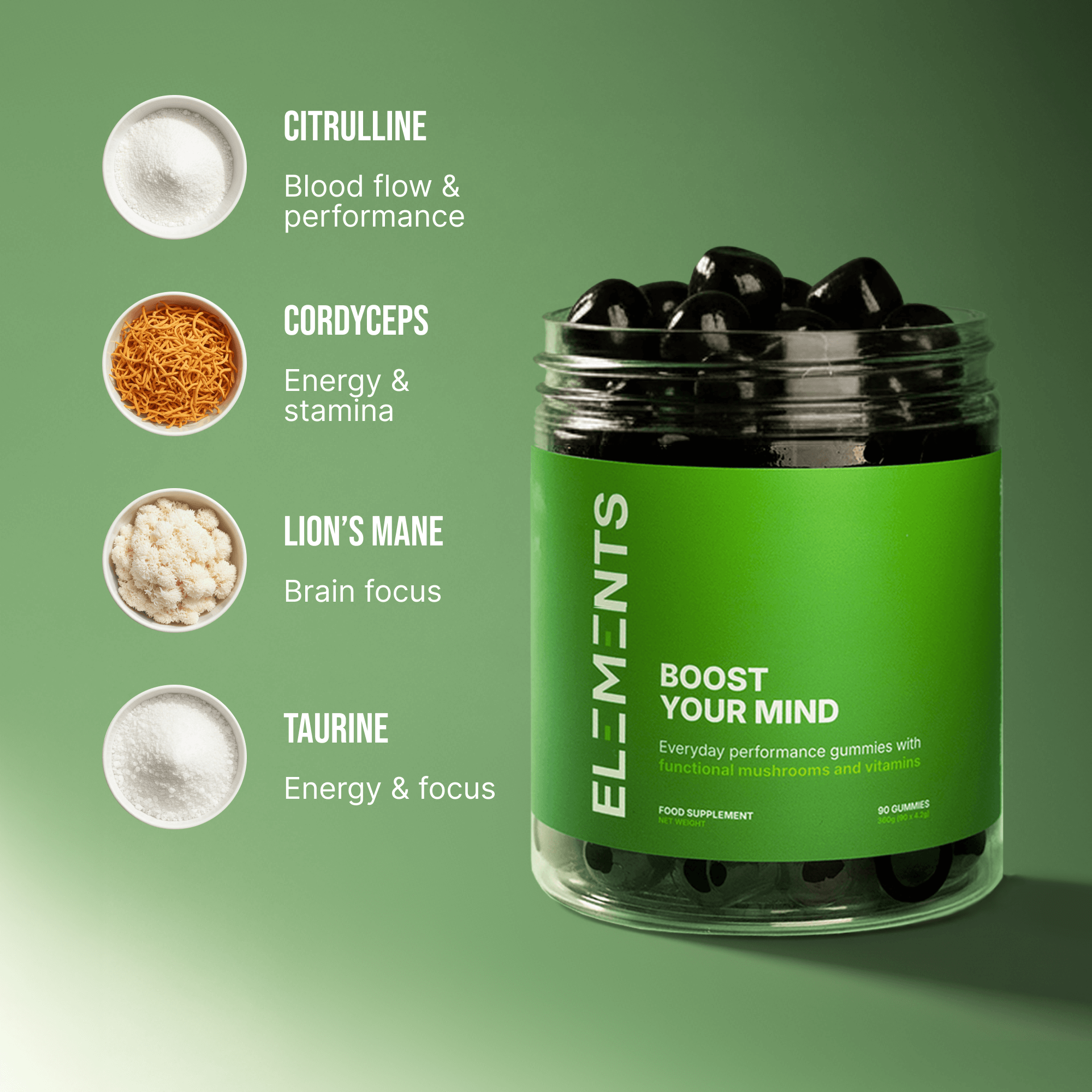 Lion’s Mane, Cordyceps, Taurine, Green Tea Extract, and B vitamins, all backed by research for brain function.