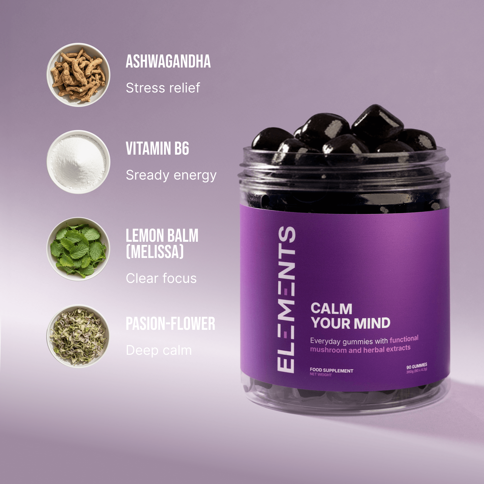 Ashwagandha, Passionflower, Lemon Balm, and B vitamins, adaptogens and botanicals trusted for centuries.