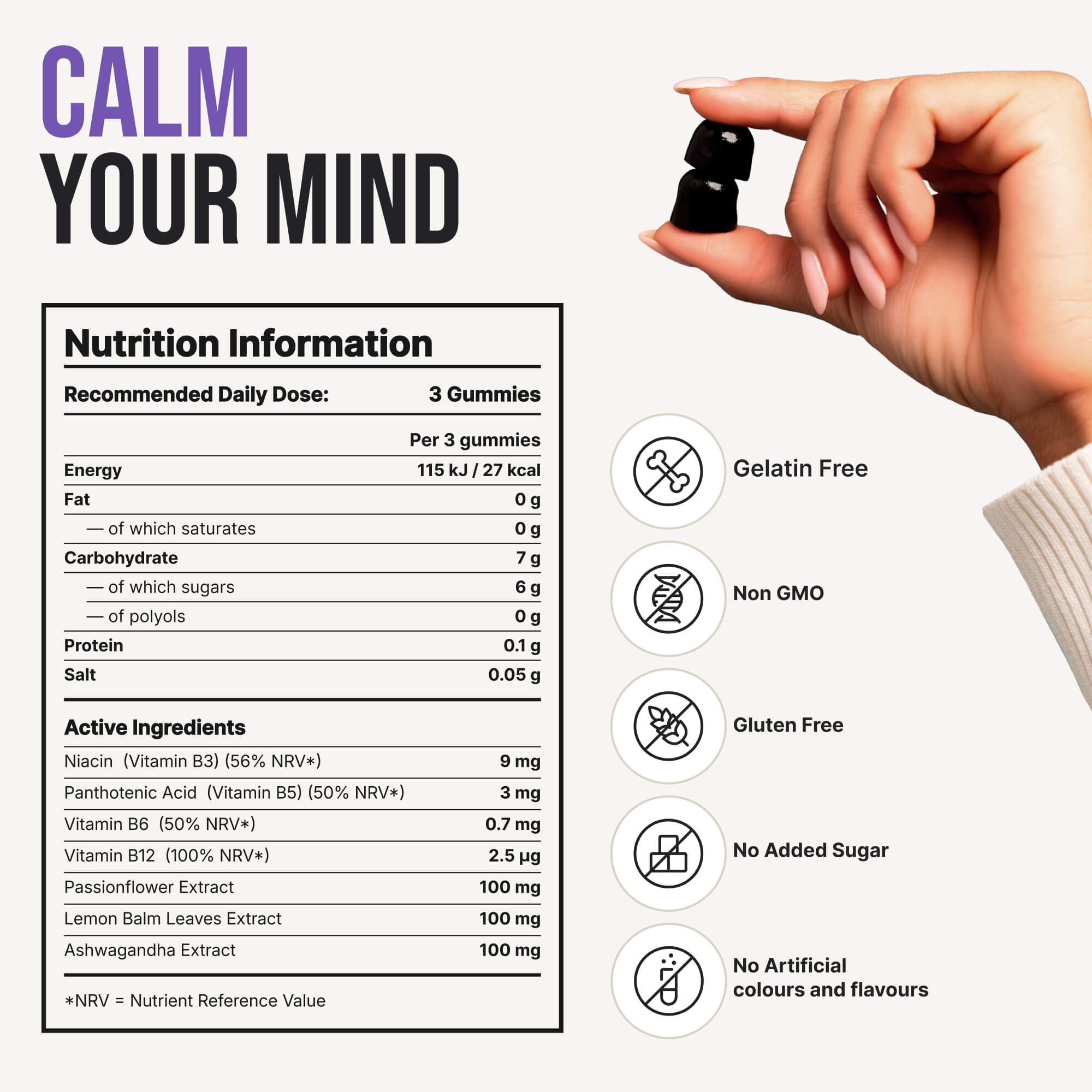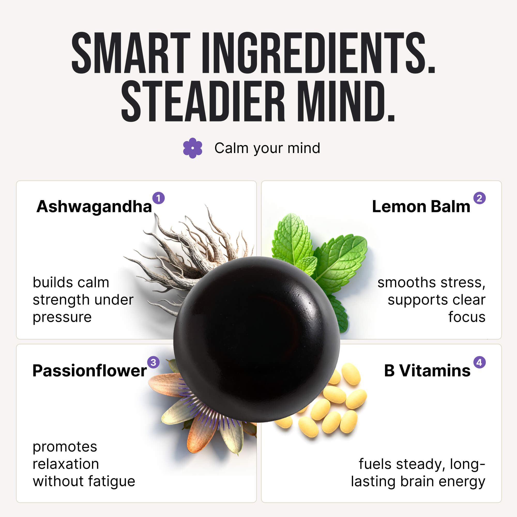 - Ashwagandha, Passionflower & Lemon Balm – promote calm, emotional balance, and resilience to stress.