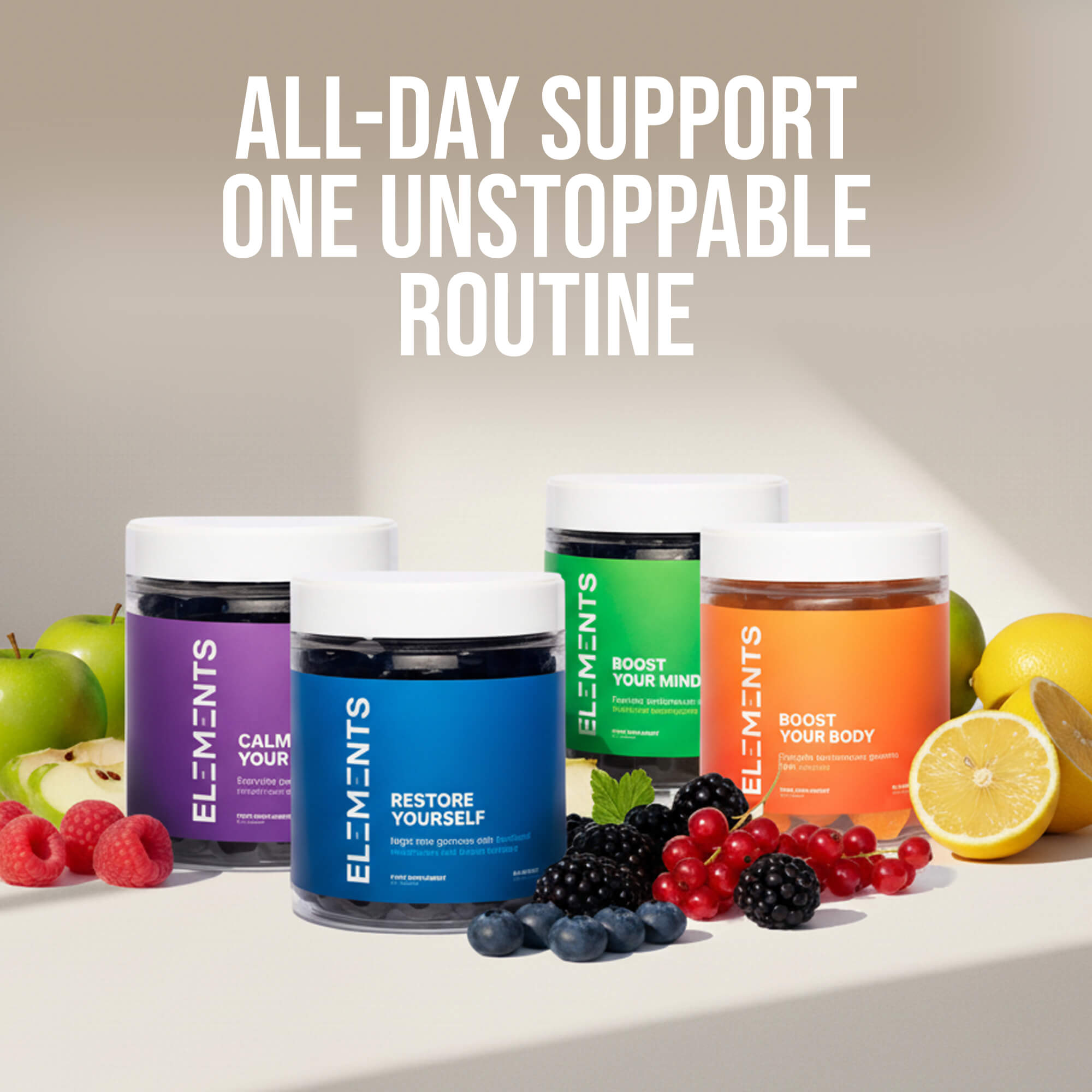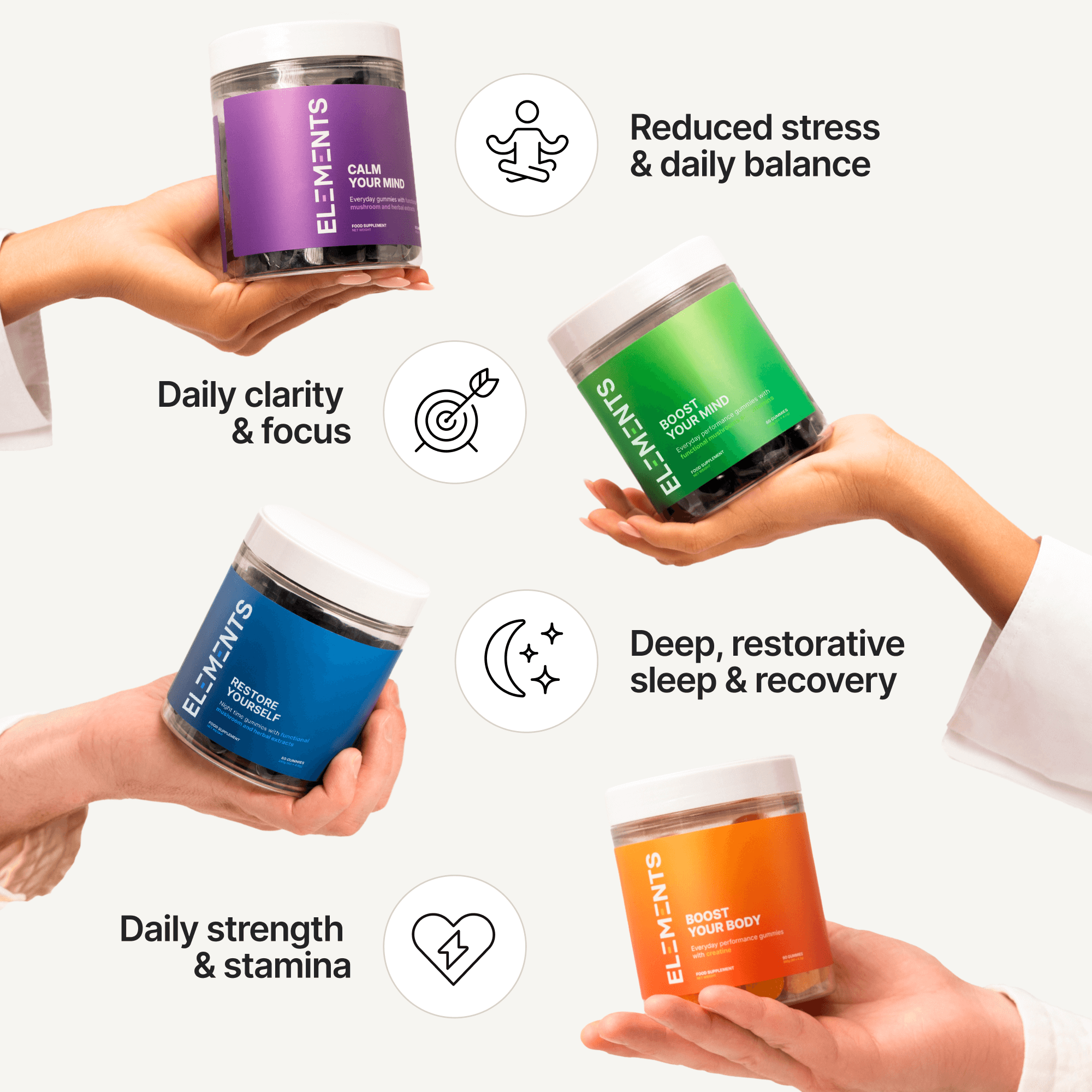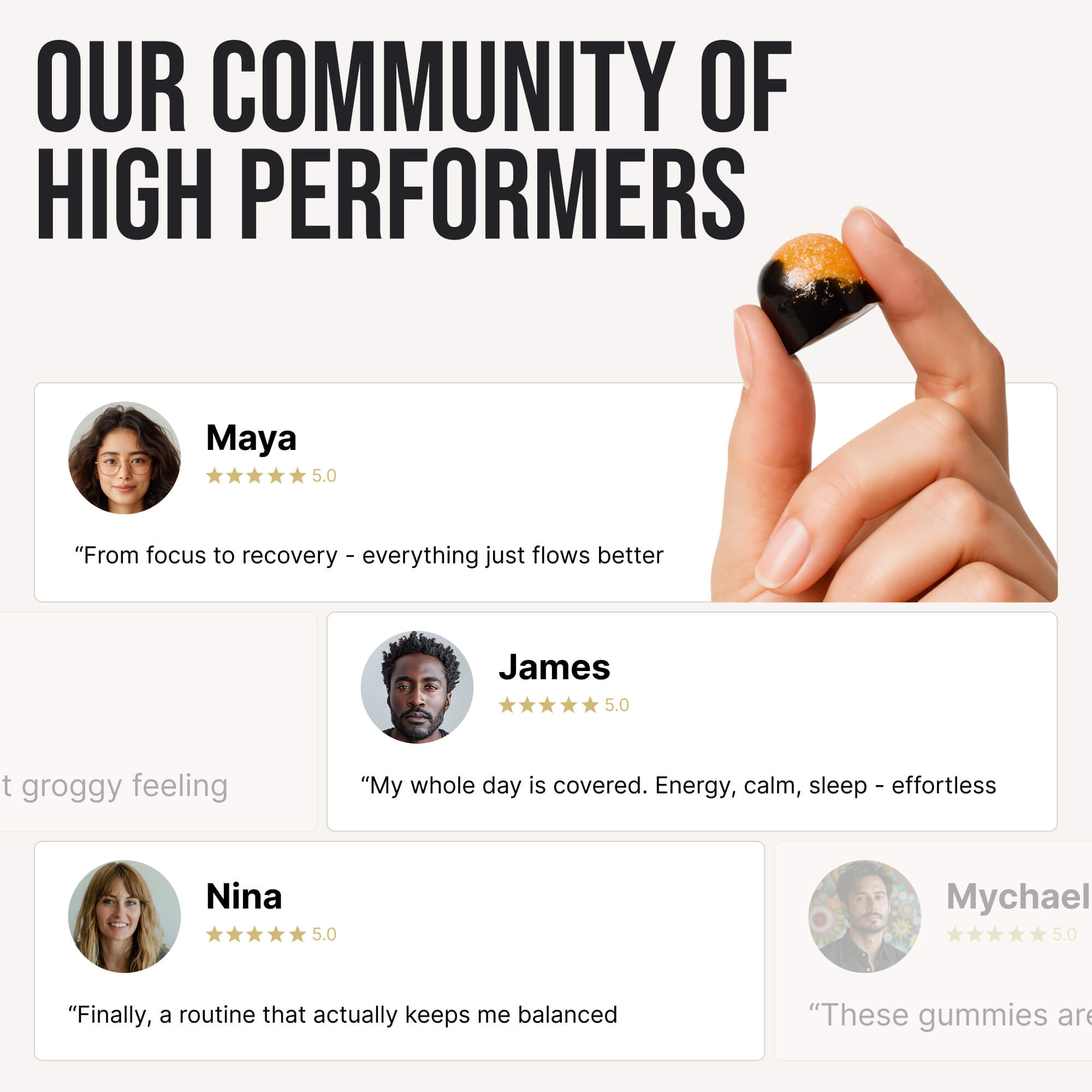 Three gummies for focus. Four gummies for strength. Three gummies for calm. Three gummies for sleep. Morning, day, evening, night - the perfect daily flow.