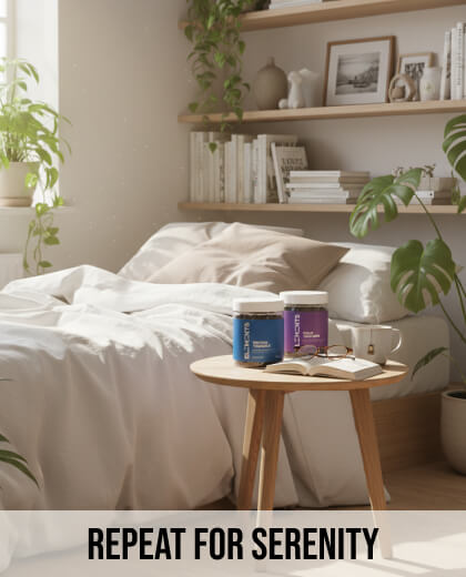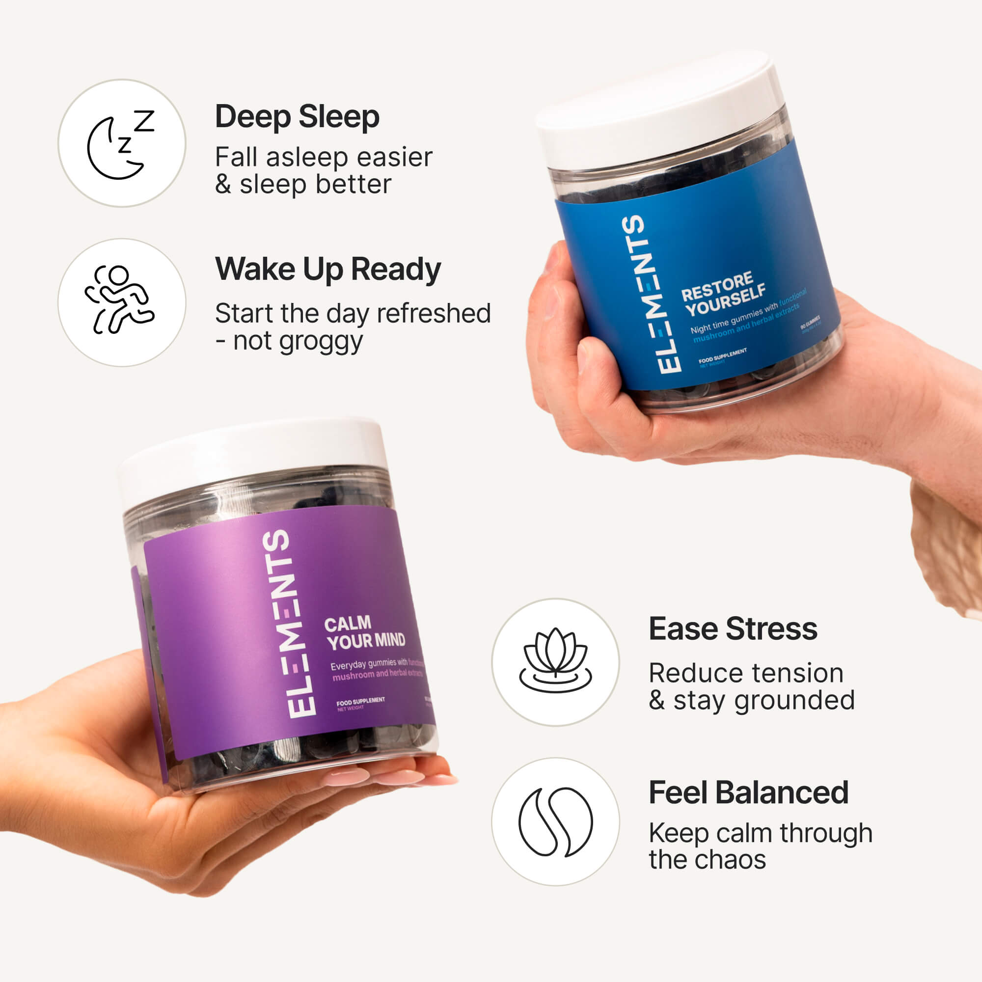Three gummies for calm. Three gummies for sleep. Take Calm Your Mind during the day, and Restore Yourself at night.
