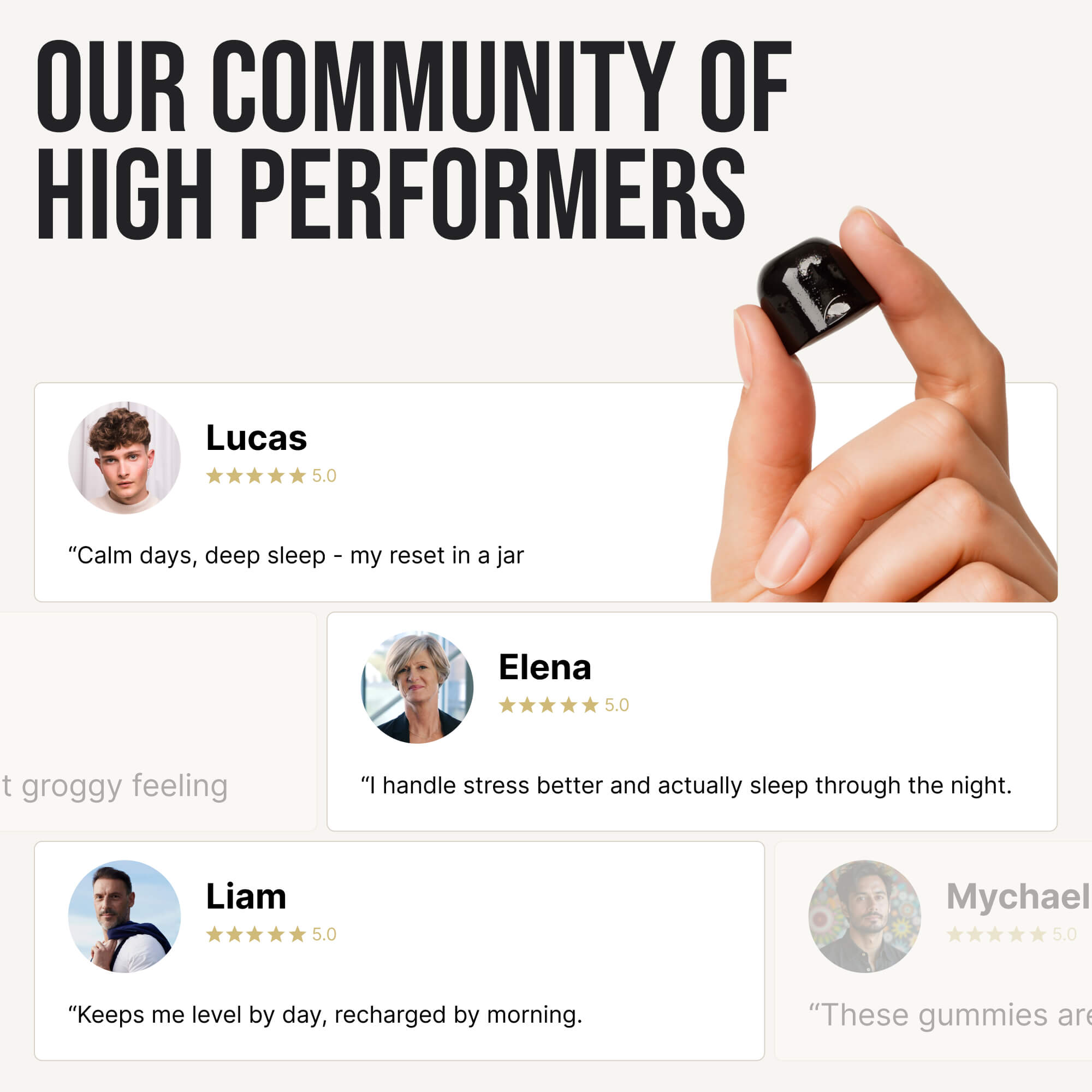 Each gummy is pre-dosed with calming botanicals, vitamins, and amino acids. Real, noticeable support for balance, rest, and recovery.